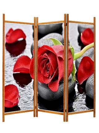 Parawan pokojowy z nadrukiem czarno-białym z akcentami kolorystycznymi umieszczonym po zewnętrznej stronie tkaniny. Za pomocą systemu skrzydeł połączonych ze sobą zawiasami, dzieli i dekoruje przestrzeń mieszkalną oraz użytkową. Jego tekstylna, delikatna w dotyku tkanina jest wytrzymała dzięki zaimpregnowaniu.