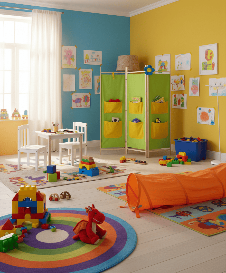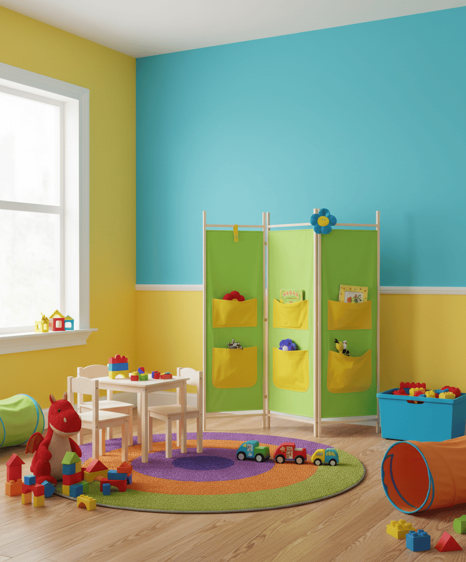 Parawan pokojowy z kieszeniami zachęci dziecko do organizowania swoich przedmiotów oraz udekoruje jego cztery ściany wieloma kolorami.