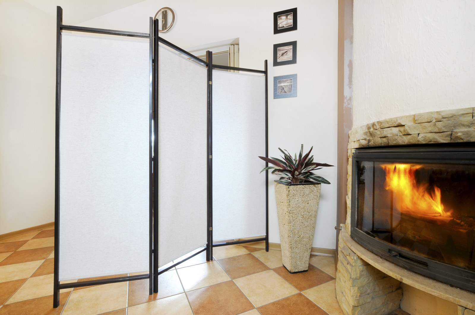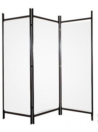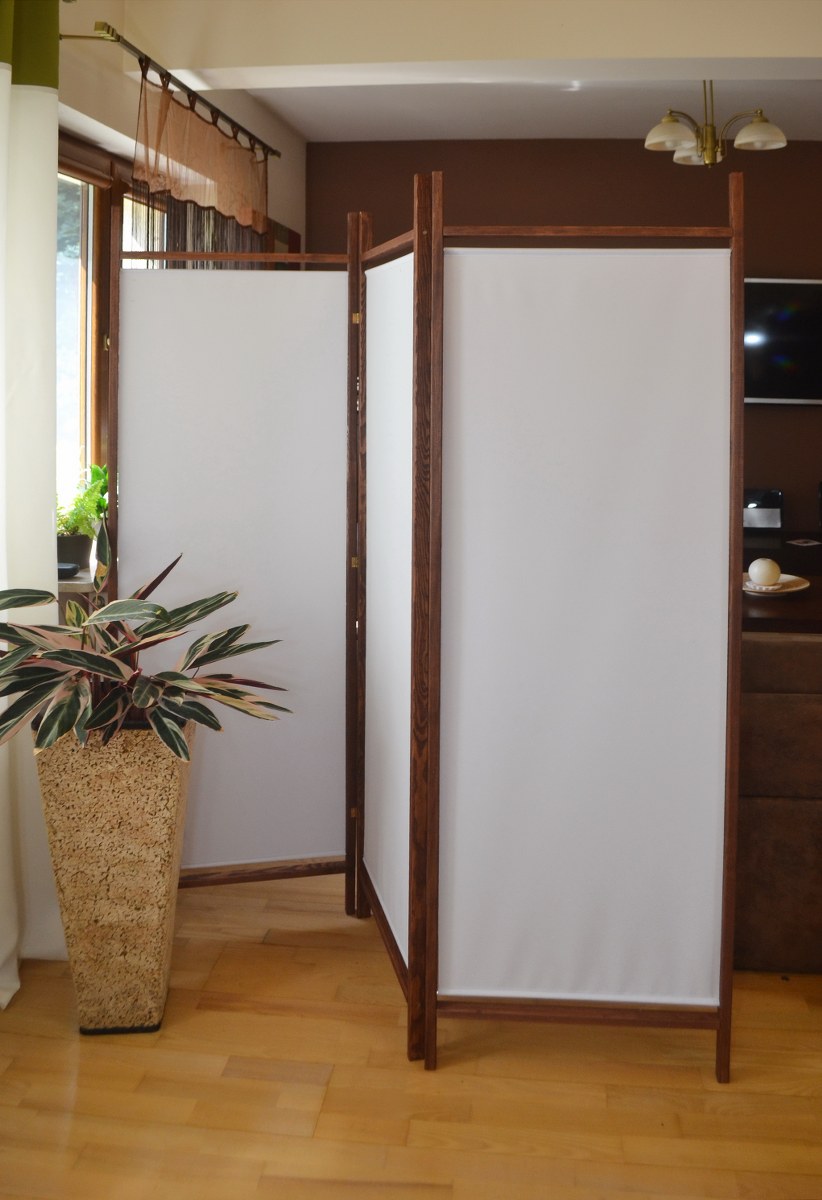 Ekonomiczny parawan dekoracyjny, wykonany z drewna i tkaniny dostępnej w klasycznych kolorach.